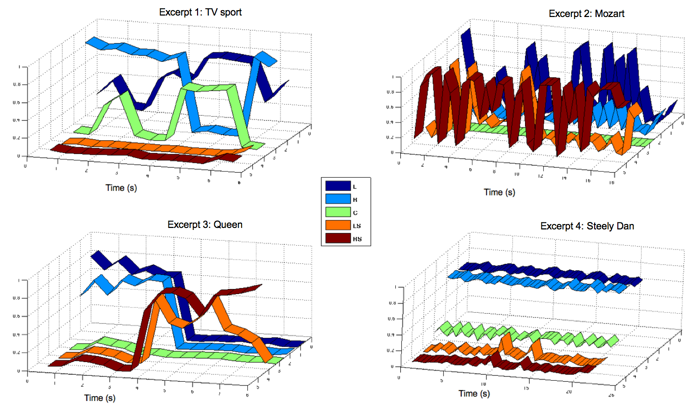 KLT is signal content dependent. The KLT transform matrix is derived based on the inter-channel statistical attributes of a multichannel programme. Since the inter-channel statistical attributes vary significantly for different programme, the signal-sensitivity ensures KLT achieve better audio quality than fixed-matrix transform in the context of HBL [P3]. The inter-channel statistical attributes also vary over time. In this work, an Audio Library consists of 140 multichannel audio excerpts was used. These excerpts were collected from more than fifty tracks and their time duration varied from 3s to 41s. The short-term KLT matrix of these excerpts were analysed using a novel visualisation technique. It was found that in many excerpts, even in very short excerpts, the KLT matrix varied considerably over time, see examples in Figure 1.