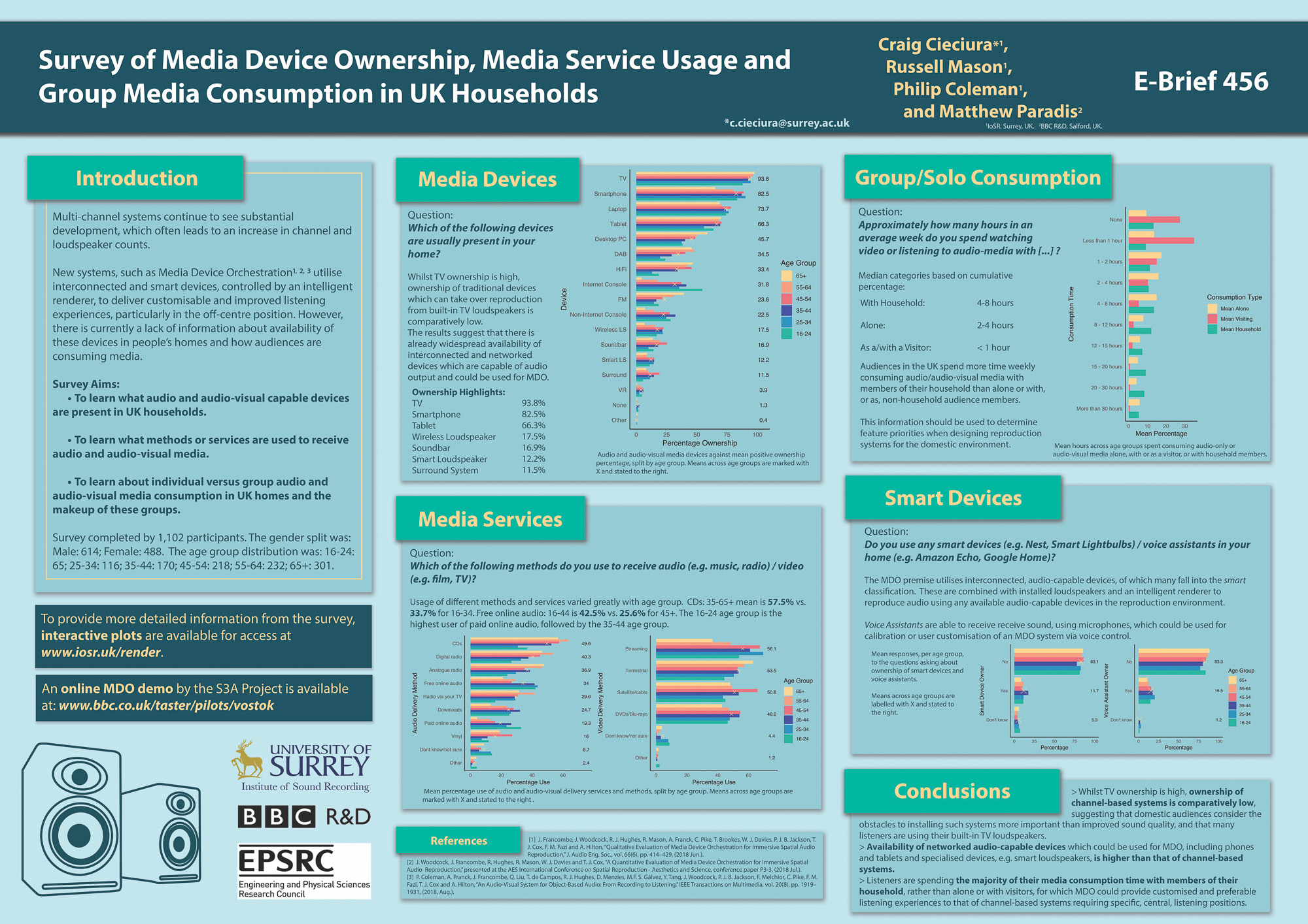 - Cieciura, C., Mason, R., Coleman, P. and Paradis, M. 2018. Survey of media device ownership, media service usage, and group media consumption in UK households, Audio Engineering Society Preprint, 145th Convention, Engineering Brief 456.