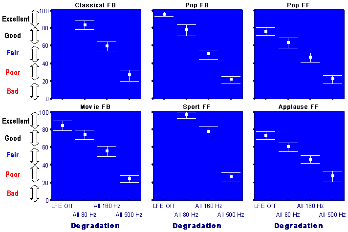 Figure 2 shows the effect of switching off the LFE channel in conjunction with high-pass filtration of all channels. Effects of switching off the LFE channel without any filtration of the main channels are also presented in this figure in order to compare the magnitude of the effect for these two types of degradation. Switching off the LFE channel combined with high-pass filtration of the main channels degraded the audio quality considerably. For all items shift of the lower boundary of the bandwidth up to 500 Hz and switching off the LFE channel degraded the audio quality to "Poor" (20-40). Obtained results show that simultaneous reduction of low frequencies in all channels considerably degrades audio quality. A similar result was obtained for the front left and right channels (Fig. 3). High-pass filtration of front left and right channels in conjunction with switching off the LFE channels caused also substantial degradation of audio quality, however a bit smaller than in the previous case. Moreover, for some items (Pop F-F and Applause F-F) band-limitation of left and right channels caused small deterioration of quality in relation to degradation of quality due to switching off the LFE channel. It can be explained by the fact that loss of LF content in left and right channels was not so noticeable because of the pronounced LF components in remaining channels.